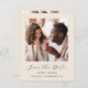 Este simples e minimalista Cartão Salvar a Data contém uma foto quadrada acima das palavras "Salvar a Data" no elegante guião branco, seguido pelos nomes do casal, data do casamento e cidade em sans serif em um fundo bege. Adicione uma segunda foto horizontal e uma mensagem mais detalhada com informações adicionais sobre o contrário.