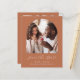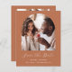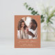Este simples e minimalista Cartão Salvar a Data apresenta um boho de fotos acima das palavras "Salvar a Data" em um elegante roteiro de manuscrito branco, seguido pelos nomes do casal, data do casamento e cidade em sans serif em um fundo de terracota. Adicione uma segunda foto horizontal e uma mensagem mais detalhada com informações adicionais sobre o contrário.