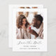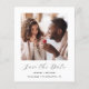 Este simples e minimalista Cartão Salvar a Data contém uma foto quadrada acima das palavras "Salvar a Data" no elegante roteiro preto de manuscrito, seguido pelos nomes do casal, data do casamento e cidade em sans serif em um fundo branco. Adicione uma segunda foto horizontal e uma mensagem mais detalhada com informações adicionais sobre o contrário.