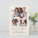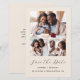 Esta simples e minimalista placa Save the Date apresenta uma colagem de 3 fotos, com uma foto horizontal no topo e duas fotos quadradas abaixo. As palavras "Salvar a Data" aparecem no elegante guião preto de escrita manual, seguido dos nomes dos casais, da data do casamento e da cidade em sans serif em fundo bege. Adicione uma mensagem mais detalhada com informações adicionais no verso.