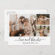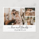 Orçamento, Moderno, Elegante, Casamento Mão-Escrito (3) Três Colagem de Fotos Obrigado Cartão-Postal em branco preto simples. modelo de obrigado de na moda com três fotos na frente e uma foto na parte de trás. Com o texto "Amor e obrigados" em uma letra de script tipográfico escrita, escrita à mão, com traços. Um coração de amor entre os nomes. Adicione seu nome personalizado e sua mensagem de obrigado. Se preferir escrever manualmente a sua nota, basta eliminar o texto de amostra para obter mais espaço.