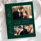 Esta simples e minimalista placa Save the Date apresenta uma fotografia horizontal na parte superior e duas fotos quadradas na parte inferior. As palavras "Salvar a Data" são executadas verticalmente para cima da margem esquerda no elegante script de escrita manual dourada. Os nomes dos casais, a data do casamento e a cidade aparecem entre as fotos de cima e de baixo em fontes sans serif em um fundo verde esmeralda. Adicione uma mensagem mais detalhada com informações adicionais no verso.