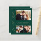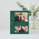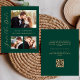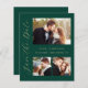 Esta simples e minimalista placa Save the Date apresenta uma fotografia horizontal na parte superior e duas fotos quadradas na parte inferior. As palavras "Salvar a Data" são executadas verticalmente para cima da margem esquerda no elegante script de escrita manual dourada. Os nomes dos casais, a data do casamento e a cidade aparecem entre as fotos de cima e de baixo em fontes sans serif em um fundo verde esmeralda. Adicione uma mensagem mais detalhada com informações adicionais na parte traseira, juntamente com um código QR para ajudar seus convidados a visitar o site do seu casamento.