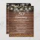 Apresentando luzes de cordas e corações delicados de ouro adoram confetti em um fundo de madeira rústica. Personalize com suas informações especiais de aniversário de 50 anos em ouro em carta chic. Projetado por Thisnotme©