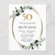 Orçamento 50º Aniversário, Convite de festas Metálico Dourado Eucalyptus... Nosso barato luxe botânico 50º convite de aniversário apresenta uma estrutura oval (faux) metálica dourada embelezada com folhas poeirentas verdes e de eucalipto abarrotado com esmeraldas criando uma fronteira elegante para o texto do convite dentro. Acima do convite está um gráfico de 50 de ouro que adiciona ao toque luxuoso deste convite de festa de aniversário de tipo único. Todo texto pode ser facilmente revisado com seus próprios detalhes no modelo de personalização.