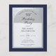 Um convite de aniversário moderno. Em um fundo retangular azul marinho, ele tem um arco azul-prateado falso que tem um marinho de texto azul sobre fundo branco. As palavras Festa de aniversário são escritas em um script caligráfico elegante; a primeira linha é o texto arquivado.