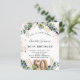 Para uma 50ª festa de aniversário. Um fundo branco decorado com verde de eucalipto e folhas de ouro. Pontos de brilho falsos do ouro. Personalize e adicione seus nomes e detalhes do casamento. Letras pretas e ouros coloridas. O número 50 é escrito com a fonte do estilo do balão. Traseira: fundo branco e pontos brilhantes de falso ouro.