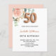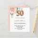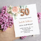 Um convite elegante para a 50ª festa de aniversário. Um fundo branco chic. Decorados com um rosa de ouro e rosa cor-de-rosa-esbranquiçada, folhas de eucalipto florais, verdes, galhos, verde e borras de ouro. Personalize e o nome e os detalhes da festa. Letras pretas e ouros. O nome é escrito com um moderno estilo escrito à mão. O número 50 é escrito com uma fonte no estilo do balão de ouro. Traseira: cor de fundo rosa dourada.