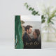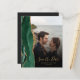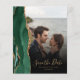 A borda esquerda deste elegante casamento moderno salve o cartão de data apresenta uma esmeralda verde aquarela agate borda com falsa brilho dourado. A sobreposição de texto personalizável combina o script de escrita manual dourada e as fontes de impressão em cima de uma fotografia da sua escolha. Um filtro de gradiente preto ajuda a fazer o pop de texto. O verso fornece espaços para quatro fotos adicionais (um quadrado, duas horizontais e uma vertical), juntamente com espaço para o URL do seu site de casamento ou outra mensagem breve em texto dourado sobre fundo fora do preto.