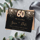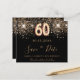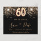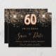 Uma moda e moda Salve a data para uma 60ª festa de aniversário. Um fundo preto decorado com falso brilho dourado. Modelos de uma data, nome e texto. Letras coloridas com ouro. O texto: Salvar a Data é gravado com um script de estilo com letra de tendência grande.