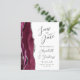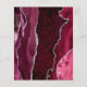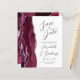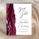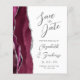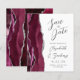A borda esquerda deste elegante cartão de salvar a data do casamento moderno apresenta uma borda de ágata em vermelho burgundy com pintura àquarela e aparada com brilho de prata falso. O texto personalizável combina caligrafia cinza carvão, copperplate e fontes itálicas em um fundo branco. O verso apresenta um design de ágata burgundy e prata correspondente.