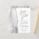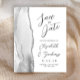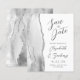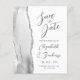 A borda esquerda deste elegante cartão de salve a data de casamento moderno apresenta uma borda de ágata em aquarela cinza aparada com brilho de prata falso. O texto personalizável combina caligrafia cinza carvão, copperplate e fontes itálicas em um fundo branco. O verso apresenta um design de ágata cinza e prata correspondente.