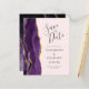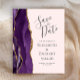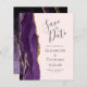 A borda esquerda deste elegante convite de casamento moderno apresenta uma cor d'água roxa, borda agitada, aparada com falso brilho dourado. O texto personalizável combina a escrita manual de cinzas de carvão, fontes em copperplate e itálico em um fundo cor-de-rosa pincelado. O verso apresenta um design de agate roxo e dourado correspondente.