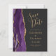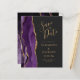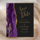 A borda esquerda deste elegante convite de casamento moderno apresenta uma cor d'água roxa, borda agitada, aparada com falso brilho dourado. O texto personalizável combina manuscritos dourados, copperplate e fontes itálicas em um fundo de cinza de carvão escuro. O verso apresenta um design de agate roxo e dourado correspondente.