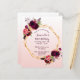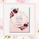 Na frente: um convite para uma festa de aniversário de 50ª (ou qualquer idade). Um rosa dourado elegante e tenente, fundo de gradiente branco com uma falso estrutura geométrica dourada. Decorados com flores roxas escuras e burgueiras, rosas e penas do estilo "boho". Modelos para um nome e detalhes da festa. O nome é escrito com um script de estilo manuscrito, letras cor roxa. Traseira: rosa dourado, fundo de gradiente branco.