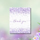 Um cartões de agradecimentos de aniversário feminino e elegante. Um fundo branco chic. Com poeira brilhante violeta e roxa. Na frente, o texto escrito em letras grandes e o texto: Obrigado. Voltar: Personalize e adicione seu nome e nota de agradecimento. O nome é escrito com um moderno estilo escrito à mão.