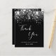 Um cartões de agradecimentos para um aniversário de 50 anos (ou qualquer idade). Uma cor preta de fundo, decorada com falso brilho prateado. Na frente, um grande script com letras brancas e maiúsculas e o texto: Obrigado, seu texto, título e uma data. Voltar: Personalize e adicione seu nome e nota de agradecimento.