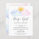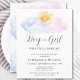 Você está planejando uma festa de revelação de gênero? Convide familiares e amigos para comemorar com este charmoso convite orçamental. Apresenta nuvens de aquarela cor-de-rosa e azul com um sorriso de sol e tipografia de na moda que diz "Menino ou Rapariga." Perfeito para uma festa reveladora de gênero em qualquer estação. Facilmente personalizável. Original Watercolor © Michele Davies.