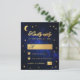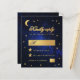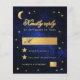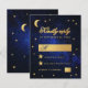Um convite de RSVP de casamento econômico com tema de casamento celestial, com a lua e estrela em um fundo azul de noite estrelada. As palavras "Respondam por gentileza" e a letra M são escritas em uma fonte caligráfica elegante. A lua e os locais para preencher são em folha de ouro falsa, os locais para aceitar e recusar são estrelas de ouro falsa. No cartão preto, há apenas a lua e estrela em um fundo azul de noite estrelada.