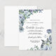 Rosas azuis empoeirados e flores silvestres decoram um bonito convite de aniversário. A caligrafia moderna acrescenta ao Boho Vibe.