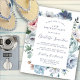 Rosas azuis empoeirados e flores silvestres decoram um bonito convite de aniversário. A caligrafia moderna acrescenta ao Boho Vibe.