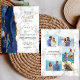 A borda esquerda deste convite de casamento moderno e elegante apresenta uma borda de água azul marinho ágata aparada com brilho dourado falso. O texto personalizável combina caligrafia dourada com fontes copperplate preta e itálica em um fundo de mármore cinza e branco. O verso fornece espaços para 4 fotos (1 quadrada, 2 horizontais, 1 vertical longa) e espaço para o URL do seu site de casamento ou outras informações.