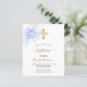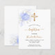 Para um batismo elegante, comemorando um menino. Um fundo branco chic. Decorados com flores claras, azuis e brancas, rosas e uma cruz de ouro falsa. Personalize e adicione o nome da criança e os detalhes. Letras pretas e ouros.