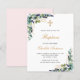 Um fundo branco decorado com verde de eucalipto e folhas de ouro e ouro. Personalize e o nome e os detalhes da cerimônia. Letras pretas e ouros coloridas. Traseira: cor de fundo cor-de-rosa pincelada.