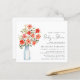 Este bonito e alegre convite para chás de fraldas amigável apresenta uma ilustração aquosa das flores vermelhas e corais e verde em um vaso de vidro azul e "Baby in Bloom" escrito em um roteiro de na moda. Adicione o nome da futura mãe e os detalhes do chá em uma simples tipografia moderna.
