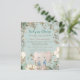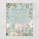 Bebê Em Chá de fraldas De Elefante Bloom Convidam. Um alternativo MENOR de 4,5" x 5,6", compatível com o orçamento. Disponível em um STOCK de PLACA SEMI GLOSS 110 lb ou um STOCK de PAPEL THINNER SATIN FINISH 80 lb. Os envelopes são um extra opcional. Este design de estilo vintage tem um elefante giro que está atrás das flores e folhagem. Você pode personalizar facilmente todo o texto de acordo com suas necessidades. Um fundo azul de pó coordenado está atrás.