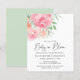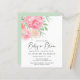 Este convite bonito e amigável para bebês, baseado em orçamento, apresenta flores cor-de-água rosa e coral e "Baby in Bloom" escrito em um roteiro contemporâneo na moda.