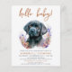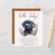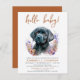 Convide seus amigos e família para comemorar a chegada do seu novo bebê com este adorável convite de chuveiros de bebês labradores negros, acessórios de festas e presentes. Este convite para o chá de fraldas apresenta um cachorrinho preto pintado à mão, perfeito para amantes de cães! A design é moderna e moderna, com um terracota laranja e esquema de cor roxa e texto de "olá bebê" para celebrar a chegada de um bebê ou menina. COPYRIGHT © 2023 Judy Burrows, Black Dog Art - Todos Os Direitos Reservados. Boho Moderno Cachorro Cachorro Terracotta Chá de fraldas Convite
