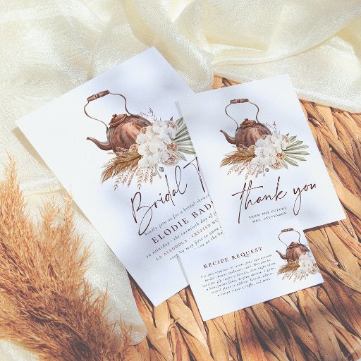 Convites de chá de noiva boho. Este encantador design econômico apresenta um bule de cobre desenhado à mão adornado com um lindo buquê floral em aquarela de grama pampas, folhas de palmeira secas, orquídeas brancas e rosas em tons de rosa poeirento. Os detalhes do evento são exibidos em tipografia serif elegante abaixo do design principal, com o verso mostrando um padrão floral e botânico correspondente. A paleta de cores terrosas em tons de marrom, terracota, laranja enferrujado, rosa suave e cores neutras adiciona um toque de charme e versatilidade a este design, tornando-o adequado para várias estações e temas. Se você está planejando uma festa de chá caprichosa na primavera, um encontro romântico de verão ou uma reunião aconchegante de outono, este convite define o tom perfeito para um chá de noiva memorável. Ideal para eventos rústicos, boêmios, festas de chá, almoços de noiva ou temas vintage, este convite pode ser facilmente personalizado com seus próprios detalhes para criar um momento verdadeiramente único e especial. Como parte da seleção econômica da Zazzle, esta folha não é um tamanho padrão de convite ou qualidade de papel. Se você deseja este design em um cartão de convite, pode encontrá-lo em nossa loja ou usar a Zazzle Make Machine para transferi-lo para o produto de sua