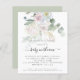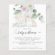 Boho Floral Eucalyptus Baby Em Bloom Invite. Um alternativo MENOR de 4,5" x 5,6", compatível com o orçamento. Disponível em um STOCK de PLACA SEMI GLOSS 110 lb ou um STOCK de PAPEL THINNER SATIN FINISH 80 lb. Os envelopes são um extra opcional. Flores e folhagem em estilo boêmio moderno, em verde-sábio e pinks de cima, com tonalidade formando-se para cair parcialmente atrás do texto. Baby In Bloom está em um script de escrita manual. Personalize facilmente o texto para seus próprios detalhes.