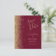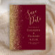 A borda esquerda deste elegante casamento moderno salve o cartão de data apresenta uma borda falsa dourada. O texto personalizável combina manuscrito pálido e dourado, fontes copperplate e itálico em um fundo vermelho burgundy. O lado inverso apresenta um burgundy e um design de ouro correspondentes.