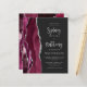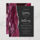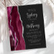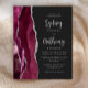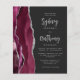 A borda esquerda deste convite de casamento moderno e elegante apresenta uma borda de ágata em aquarela borgonha aparada com brilho falso de prata. O texto personalizável combina caligrafia em cinza prateado e fonte sans serif em um fundo preto claro. O verso apresenta um design correspondente de ágata borgonha e prata.