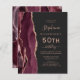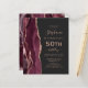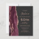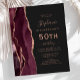 A borda esquerda deste elegante e moderno convite de aniversário 50º apresenta uma borda de cor d'água borrifada, aparada com cintilação falsa em rosa. O texto personalizável combina manuscritos rosa, copperplate e fontes itálicas em um fundo preto de ardósia. O lado inverso apresenta um design de burgundy e ouro-rosa.