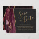 Este elegante cartão de salvar data com orçamento apresenta uma borda de ágata em aquarela burgundy aparada com brilho de ouro falso. O texto personalizável combina fontes de escrita à mão em cor de ouro, copperplate e itálico em um fundo cinza carvão. O verso apresenta um design de ágata burgundy e ouro correspondente.