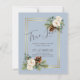 Belas rosas brancas, folhas de eucalipto, pinhas rústicas e uma moldura dourada caracterizam este item de casamento de inverno que faz parte de uma coleção maior que inclui convites de casamento econômicos, save the dates, RSVPs, etiquetas, presentes, papelaria e muito mais. Para um planejamento de casamento de inverno GRATUITO, visite weddingdesignchic.com.