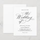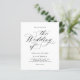 Este convite de casamento apresenta um design elegante e minimalista, com caligrafia preta clássica e fontes serifadas em um fundo branco.