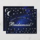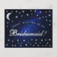 Uma proposta celestial de madrinha. Ele tem um texto amarelo ouro sobre o fundo azul do céu marinho, com estrelas douradas falsas e lua. A palavra Bridesmaid na frente (ou seja, em folha de ouro falsa) e a mensagem no verso são escritas em um roteiro caligráfico elegante, o texto arquivado "[Name] você será meu" acima da palavra Bridesmaid em pequenos bonés.