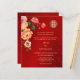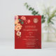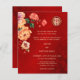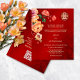 Esta versão tem um título para adicionar os NOMES DO PAI. Flores de pénia vermelha, laranja e amarela, com fundo de ximersão vermelho. Convite para casamento chinês com um símbolo de felicidade duplo xi ouro. Altere o código qr de trás, adicionando a URL do seu site de casamento.
