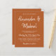 Elegante trendy tipografia do orçamento barato convite para casamento em simples terracota laranja queimada e letras brancas com nomes de noiva e noivo com roteiro de caligrafia. ++++++++++++++++++++++ Você pode alterar as cores do texto e do plano de fundo após selecionar a opção PERSONALIZAR mais. +++++++++ O convite é adequado para qualquer época - primavera, verão, outono, inverno - recepção de casamento interior.