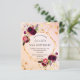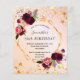 Na frente: Um convite para uma festa de aniversário de 50 anos, 50 (ou qualquer idade). Um rosa dourado, fundo branco cor-de-rosa cor-de-rosa com uma falso estrutura geométrica dourada. Decorados com flores roxas escuras e burgueiras, rosas e penas do estilo "boho". Estrelas douradas falsas pingando. Personalize e adicione um nome e detalhes da parte. O nome é escrito com um script de estilo manuscrito, letras pretas. Traseira: Rosa dourado, verde-claro-gradiente cor-de-rosa e estrelas ouro.