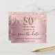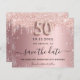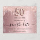 Um cartão de Save the Date feminino e moderno para uma festa de 50º aniversário. Fundo degradê rosa com decoração de glitter rosa dourado e prata falsa. Personalize e adicione uma data e nome/texto. O texto: Save the Date é escrito com uma fonte script moderna e com floreios. Número 50 em uma fonte estilo balão.