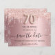 Um cartão Save the Date feminino e moderno para uma festa de 70º aniversário. Fundo gradiente rosa bege decorado com gotas e poeira de brilho rosa dourado e prata falsa. Personalize e adicione uma data e nome/texto. O texto: Save the Date é escrito com um estilo de letra manuscrita grande e moderno com floreios. Número 70 com uma fonte estilo balão.