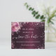Um cartão moderno Salve a Data para uma festa de aniversário de 50 anos (ou qualquer idade). Uma cor de fundo metálica falsa burgundy. Decorado com flores rosa, rosas e falsa poeira brilhante. O texto: Salve a Data é escrito com um estilo de letra grande e moderno.