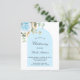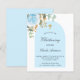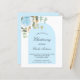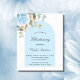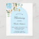 Um fundo branco decorado com folhagem de eucalipto, uma rosa azul clara e folhas douradas e uma moldura de arco azul. Personalize com o nome da criança e detalhes da cerimônia. Estilo de letra elegante e manuscrita.