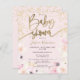 Festa de chá de bebê com aguarela floral solta em tons pastel suaves e acessível, com arranjo de flores pintadas à mão em tons suaves de rosa, amarelo e pêssego, e caligrafia moderna e elegante, além de confetes cintilantes dourados e uma escrita elegante dourada.