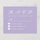 Um orçamento de RSVP simples e minimalista para um casamento. Tem apenas texto branco em fundo lavanda (roxo). O título RSVP e a letra M são escritos em uma fonte caligráfica elegante, o resto em maiúsculas.